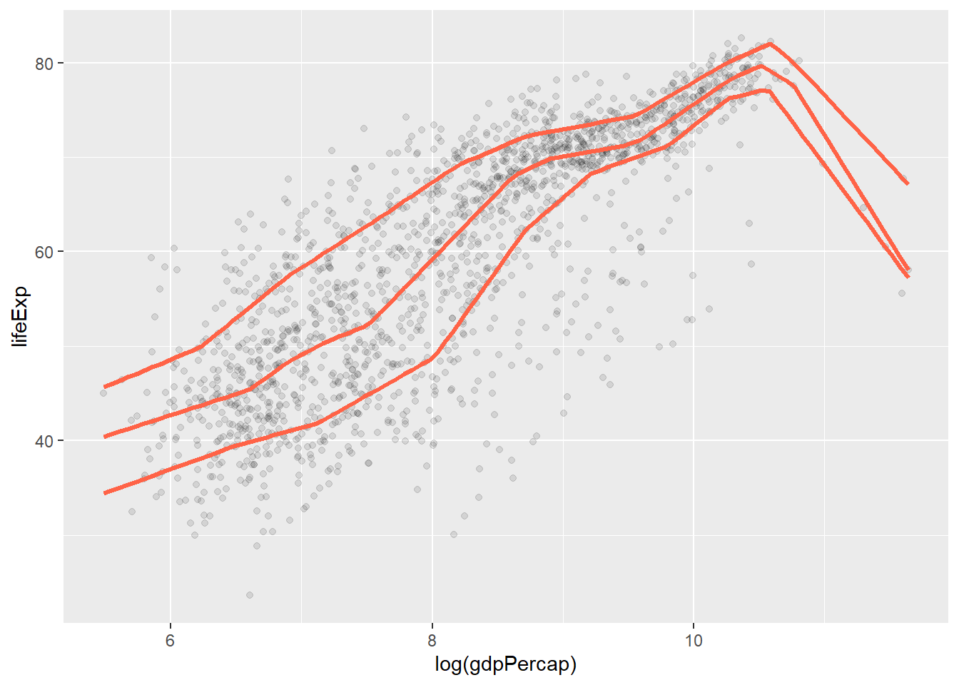 geom_quantile( # specialized version of geom)smooth that can fit quantile regression