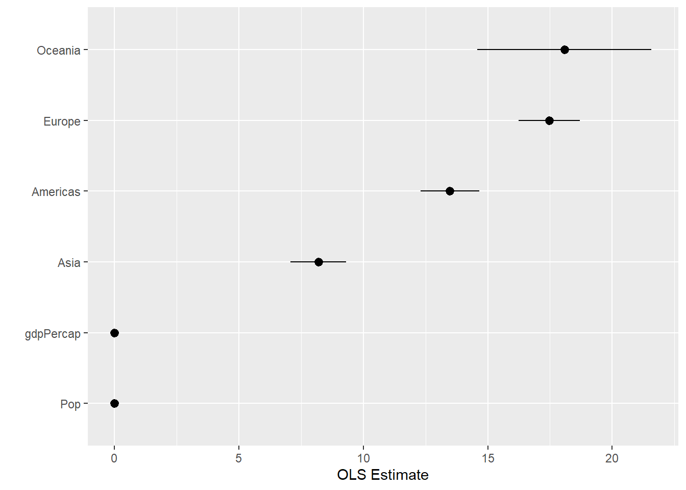 p + geom_pointrange() + coord_flip() + labs(x = "", y = "OLS Estimate")