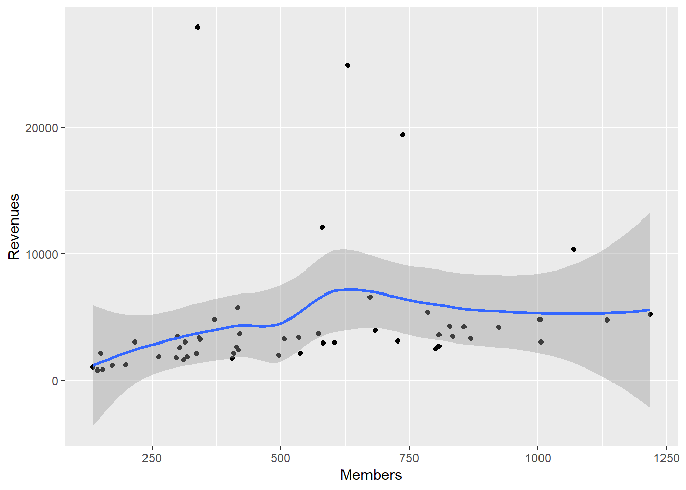 p <- ggplot(data = yahoo, mapping = aes(x = Employees, y = Revenue))