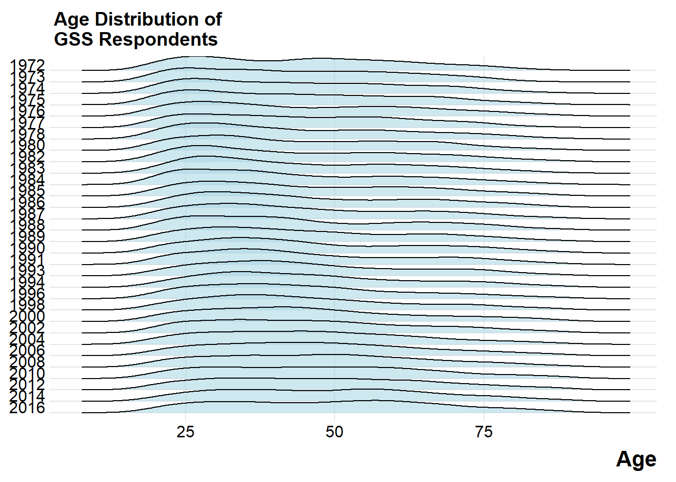 scale = 1.5) + scale_x_continuous(breaks = c(25, 50, 75)) + scale_y_discrete(expand = c(0.01, 0)) + labs(x = "Age", y = NULL, title = "Age Distribution of\nGSS Respondents") +