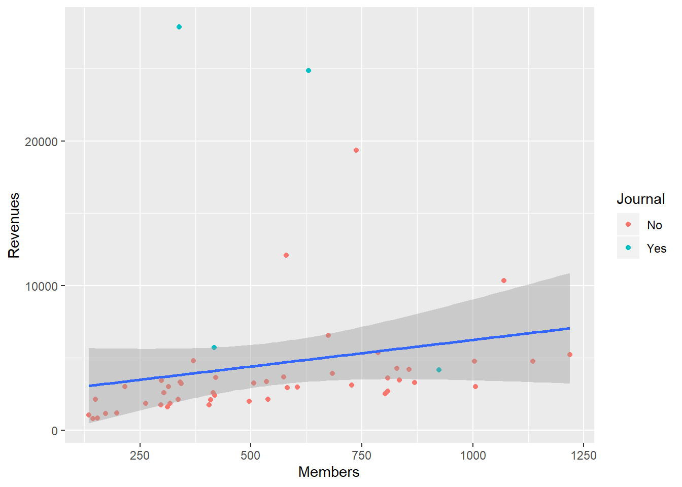 p + geom_point(mapping = aes(color = Journal)) + geom_smooth(method = "lm")