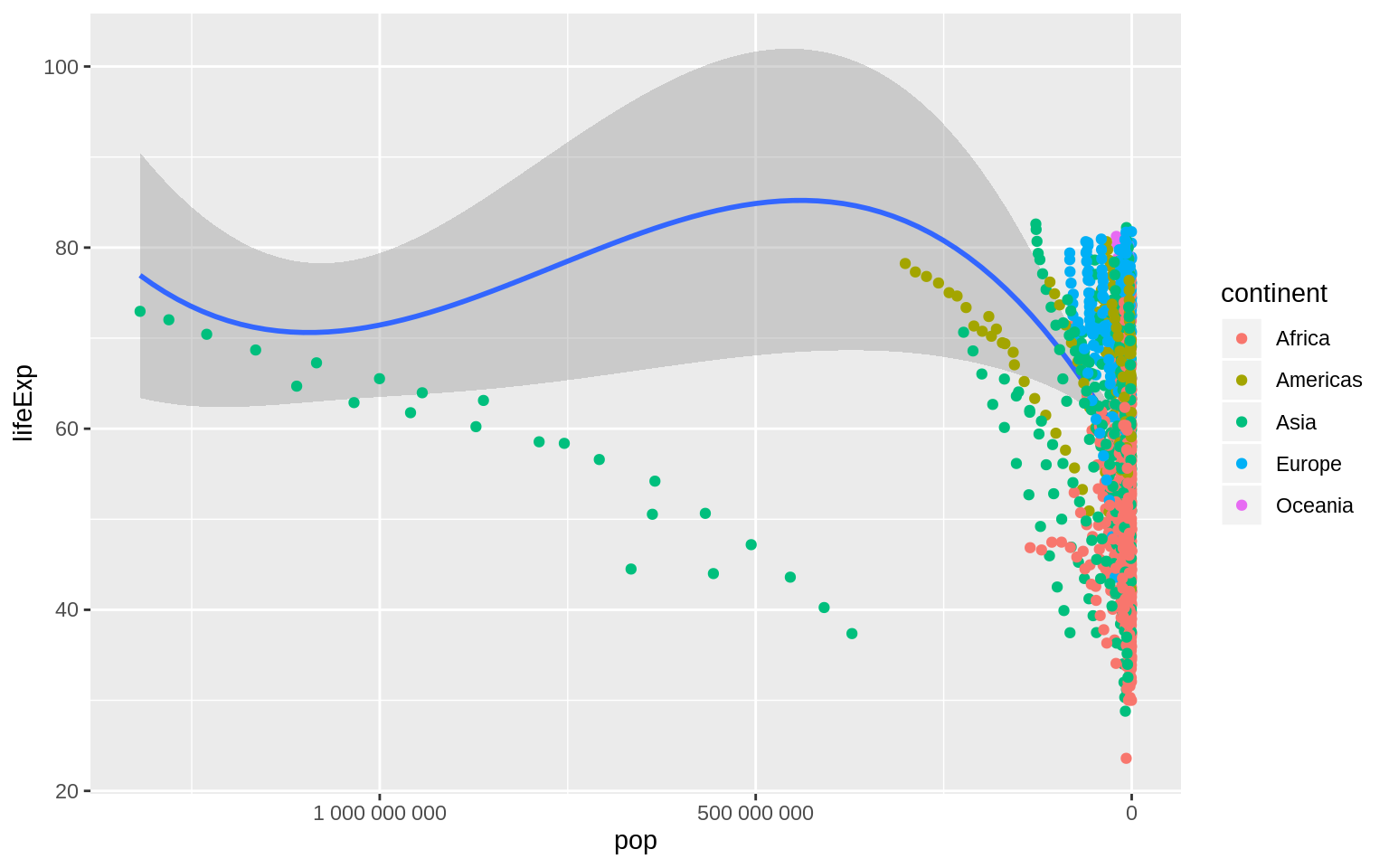 p <- ggplot(data = gapminder, mapping = aes(x = pop, y = lifeExp))