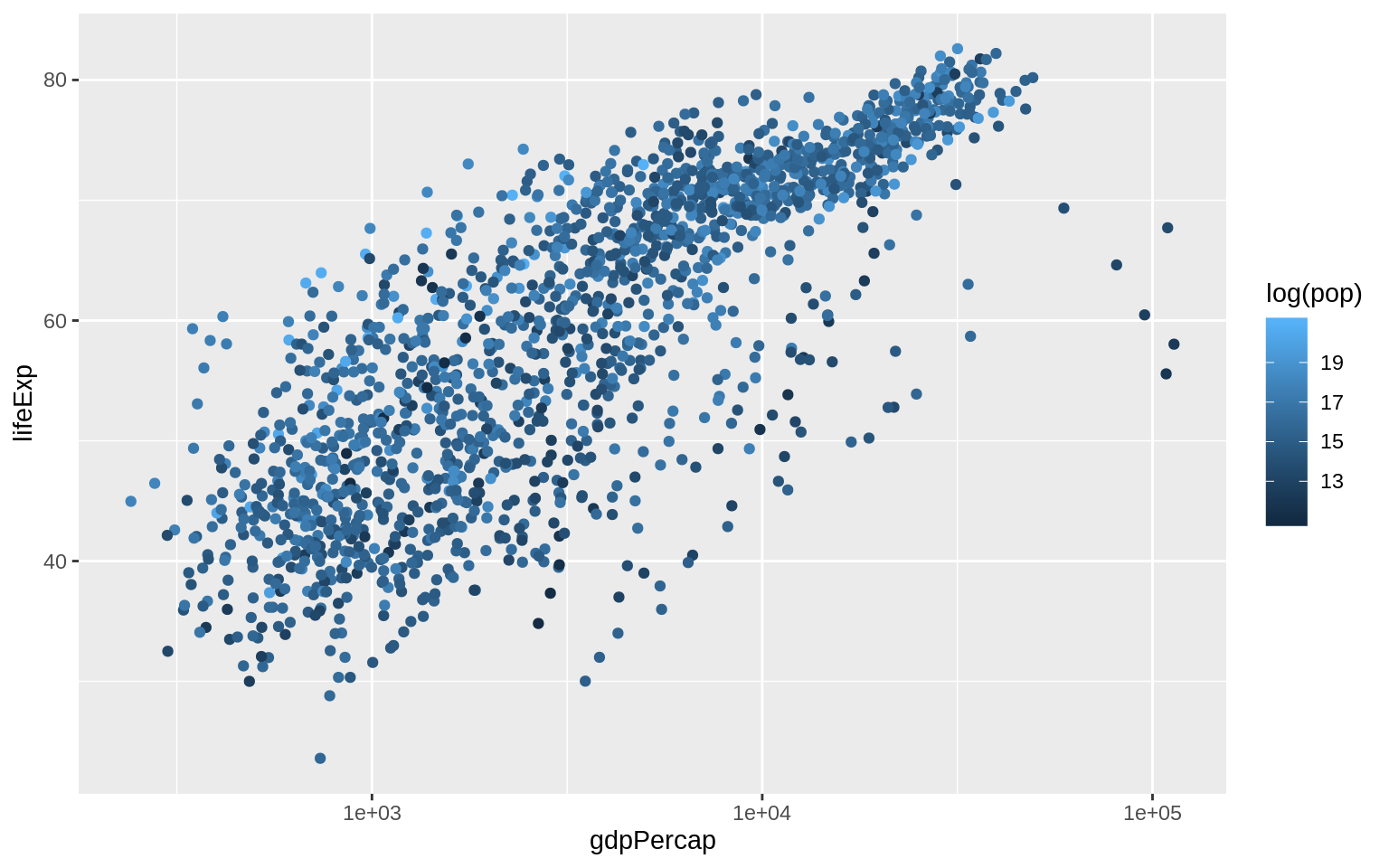 p + geom_point(mapping = aes(color = log(pop))) + scale_x_log10()