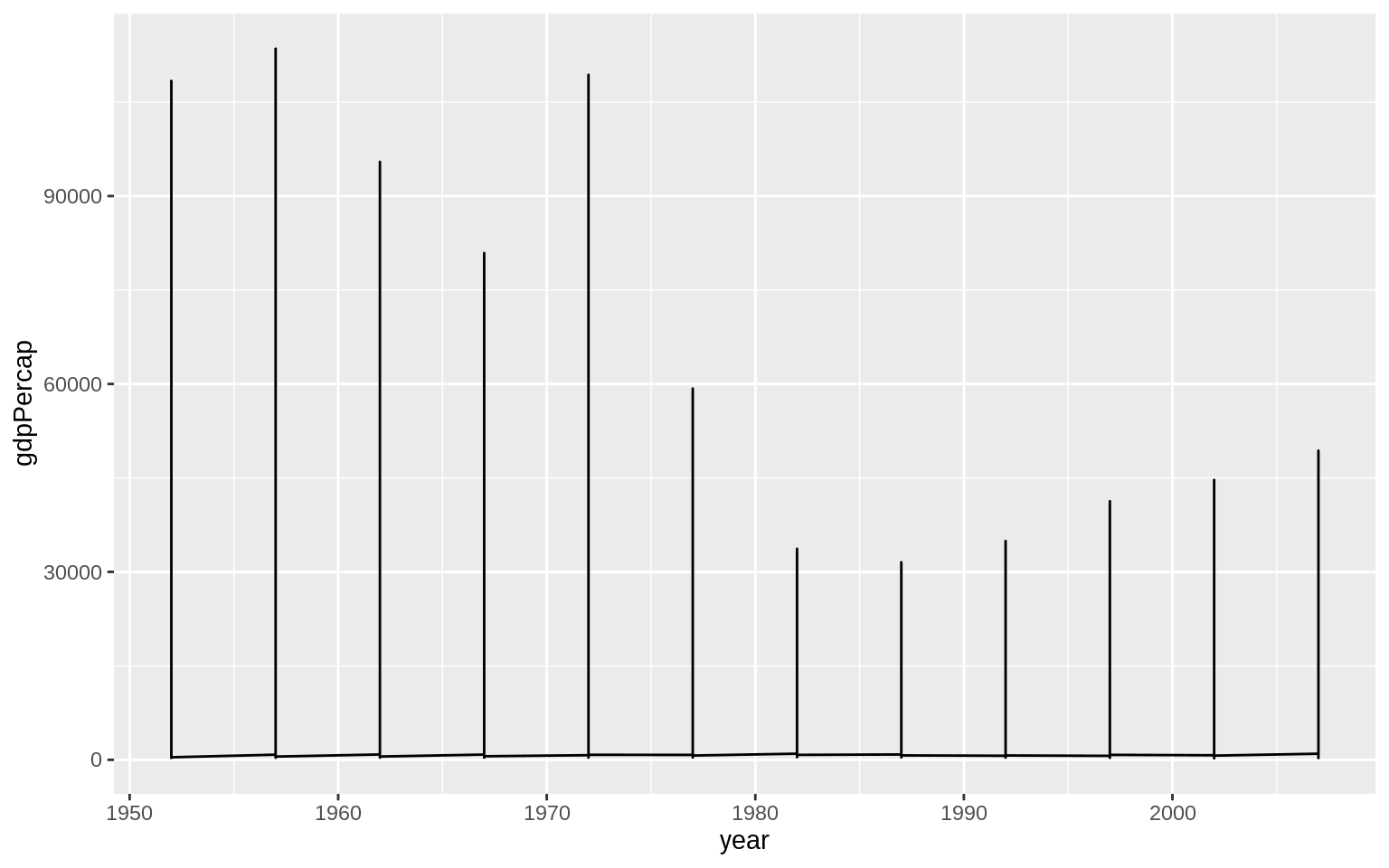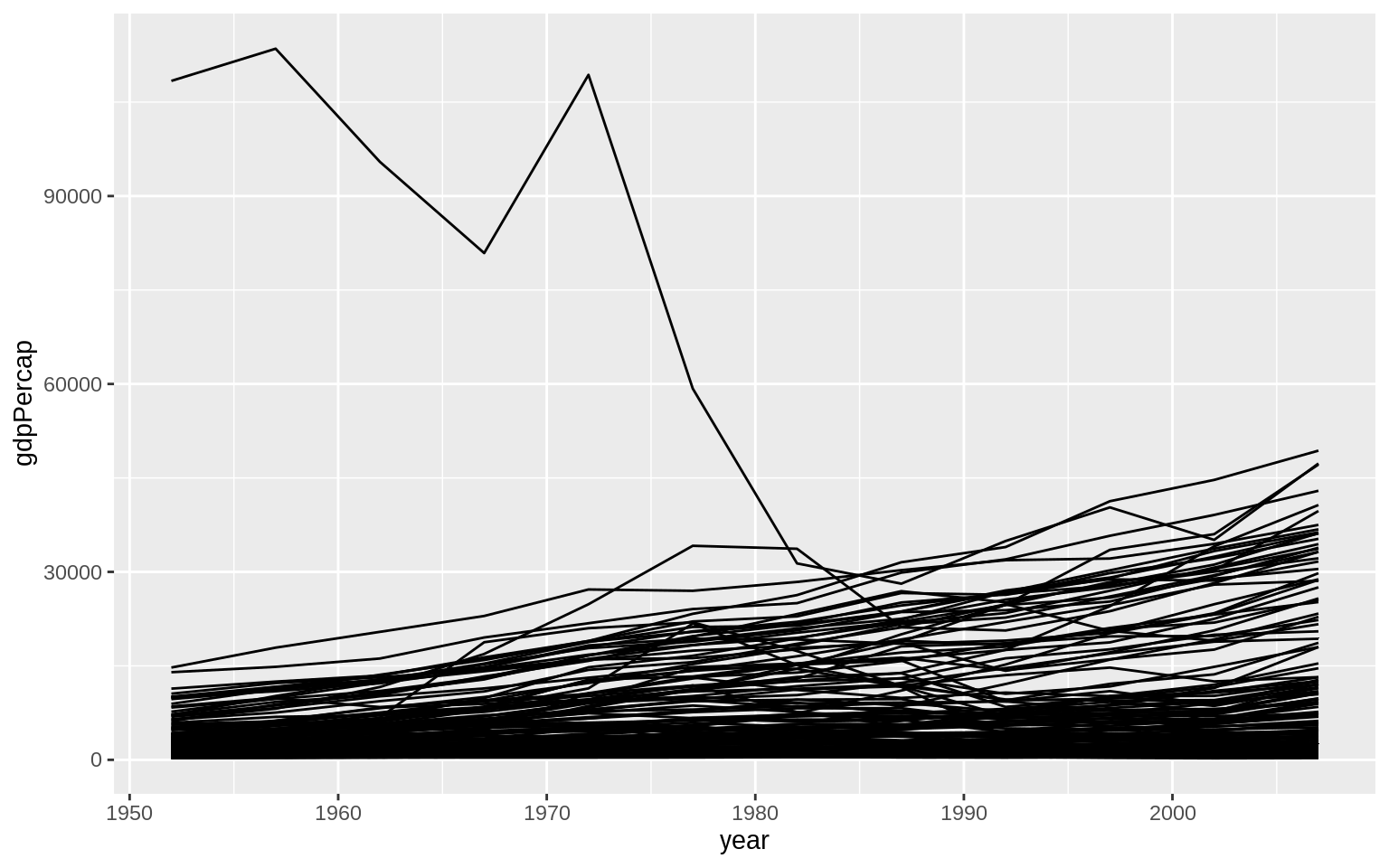 p <- ggplot(data = gapminder, mapping = aes(x = year, y = gdpPercap))