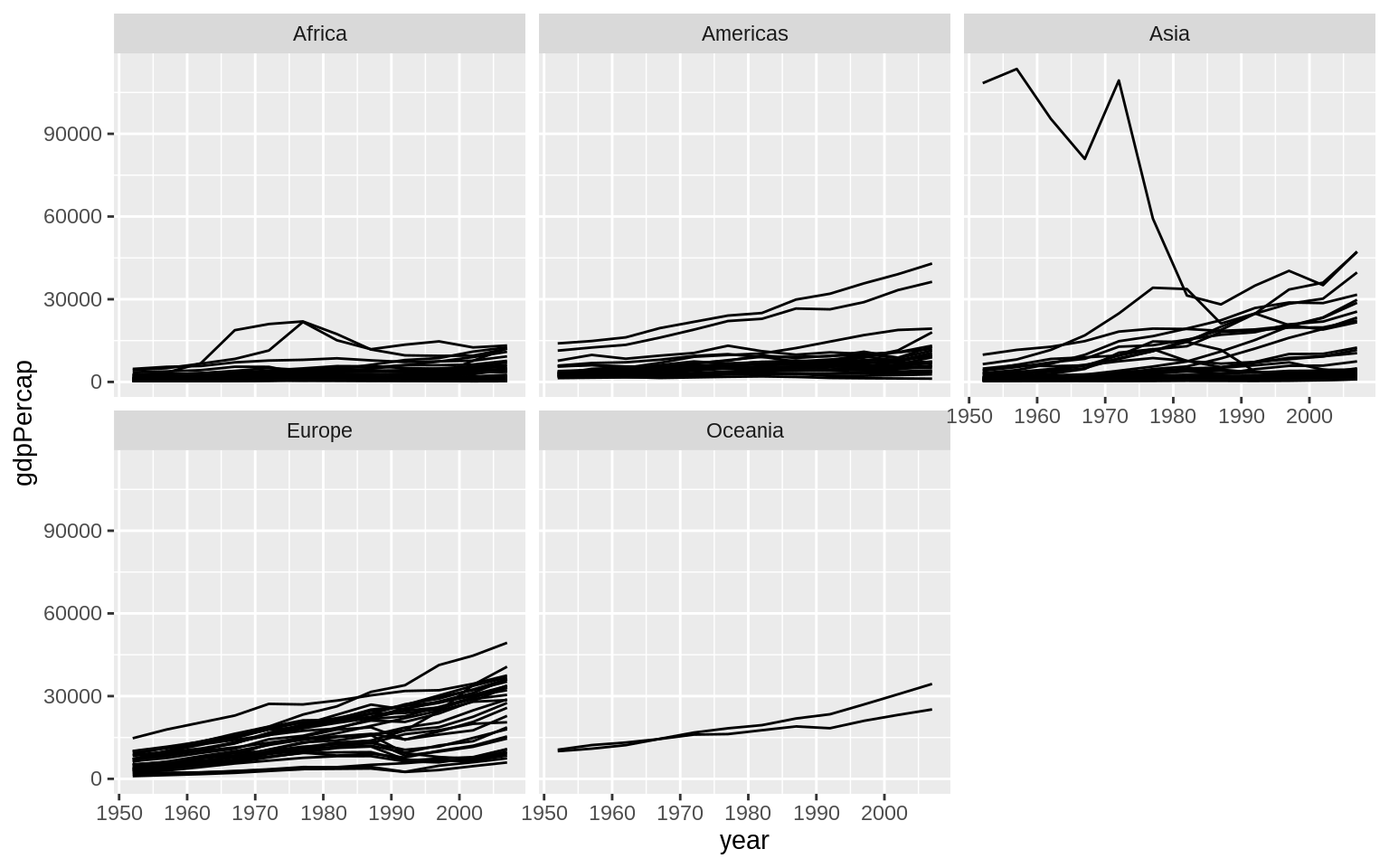 p + geom_line(aes(group = country)) + facet_wrap(~continent)