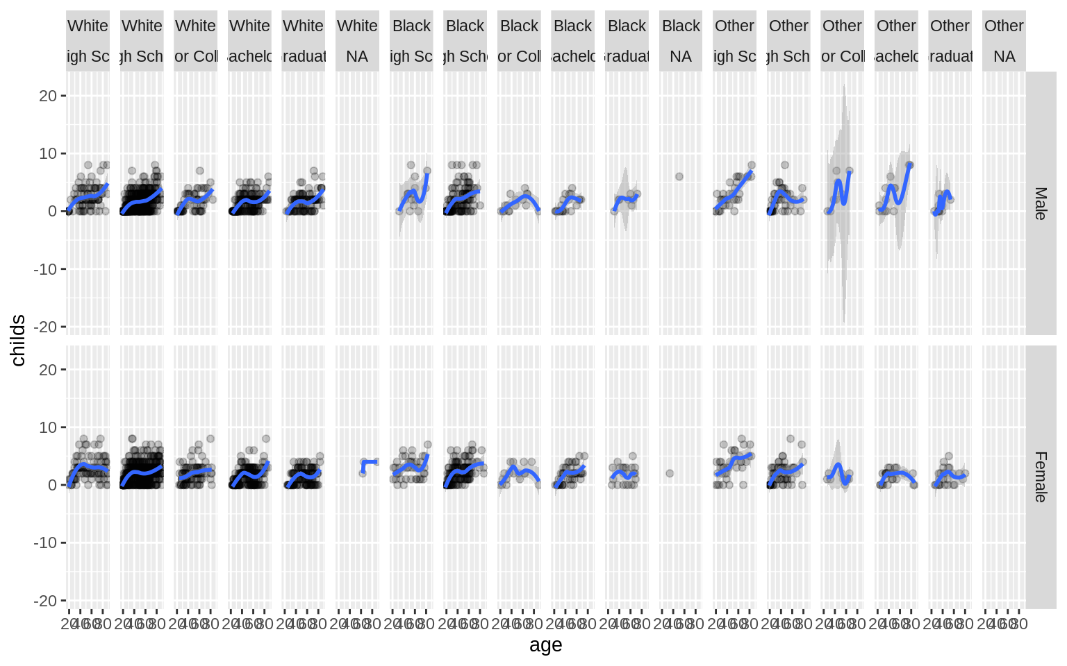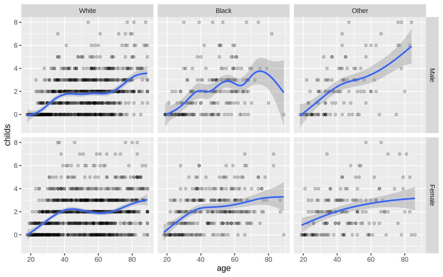 p <- ggplot(data = gss_sm, mapping = aes(x = age, y = childs))