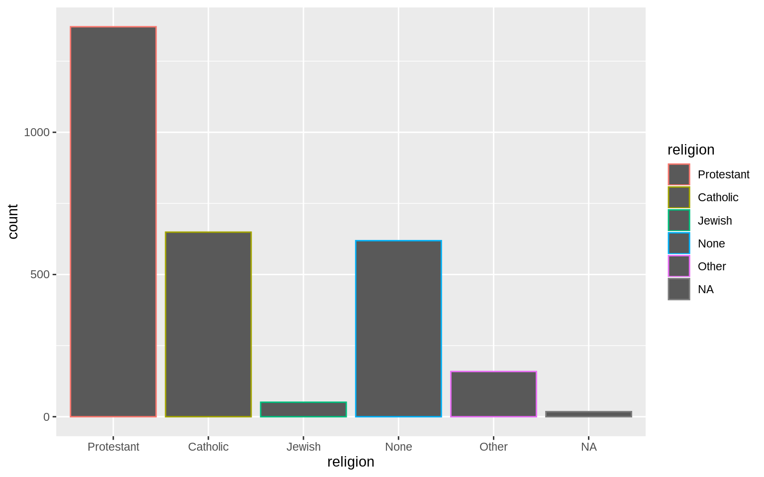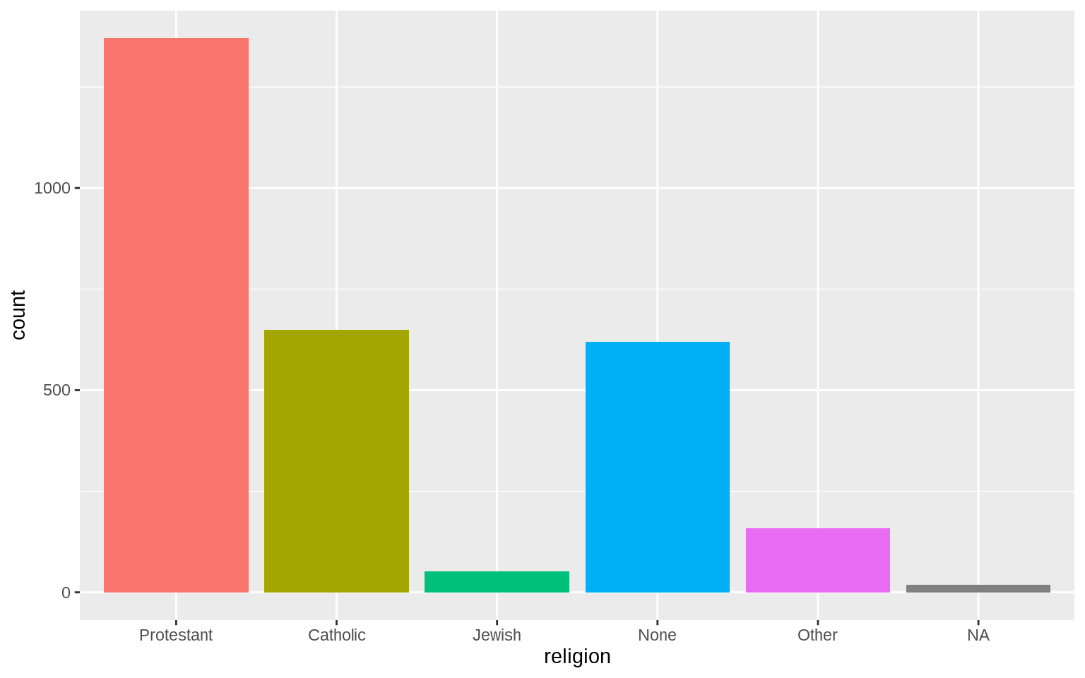 p <- ggplot(data = gss_sm, mapping = aes(x = religion, color = religion))