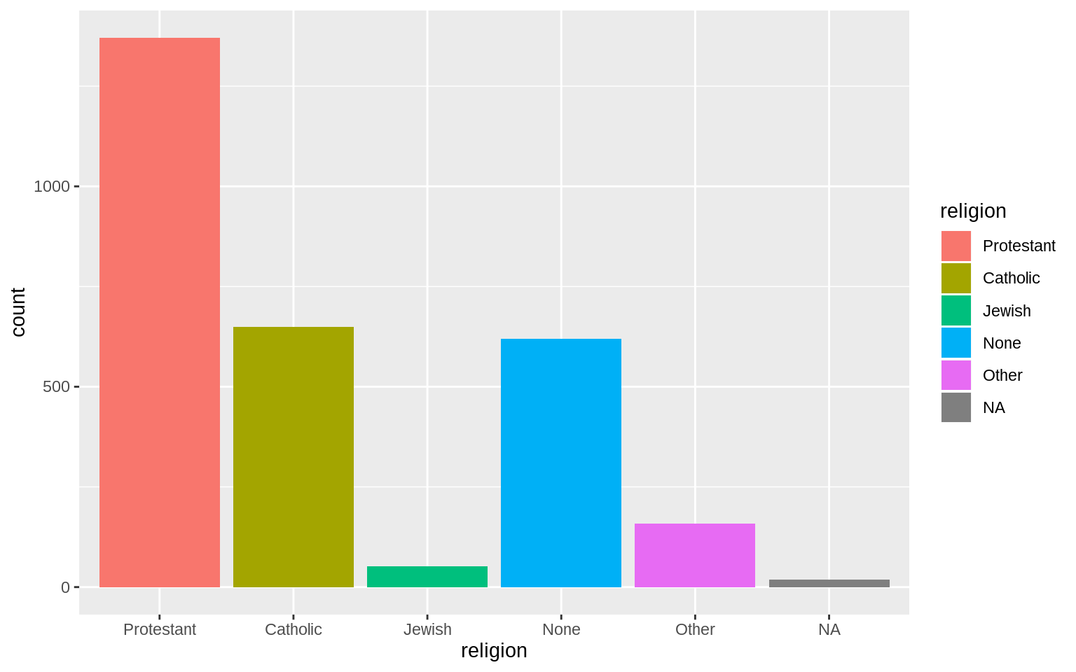 p <- ggplot(data = gss_sm, mapping = aes(x = religion, fill = religion))