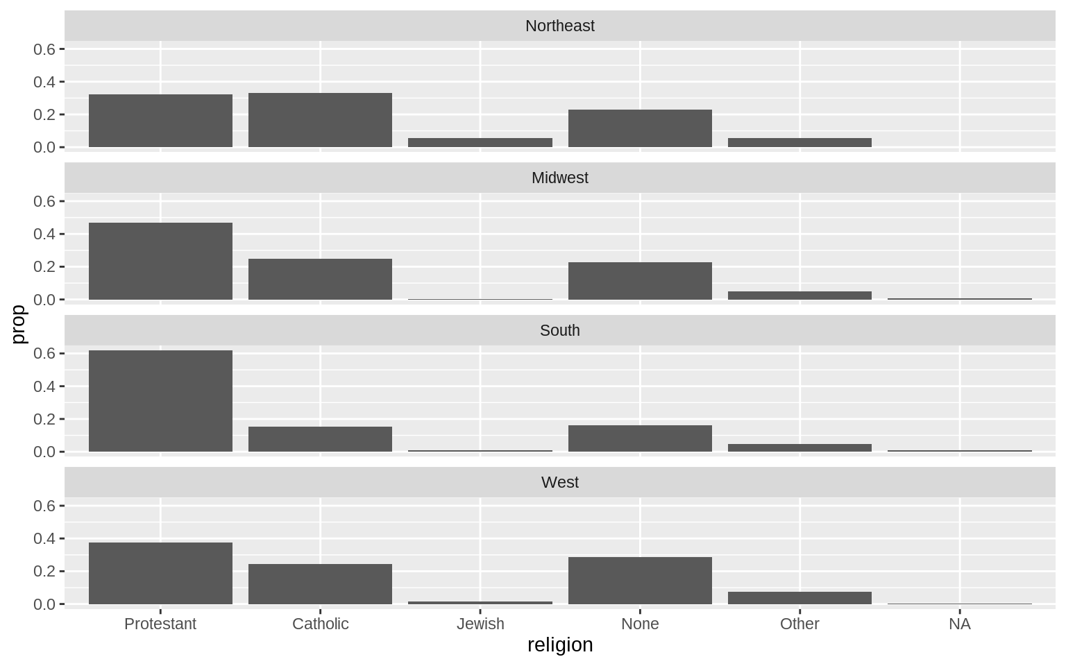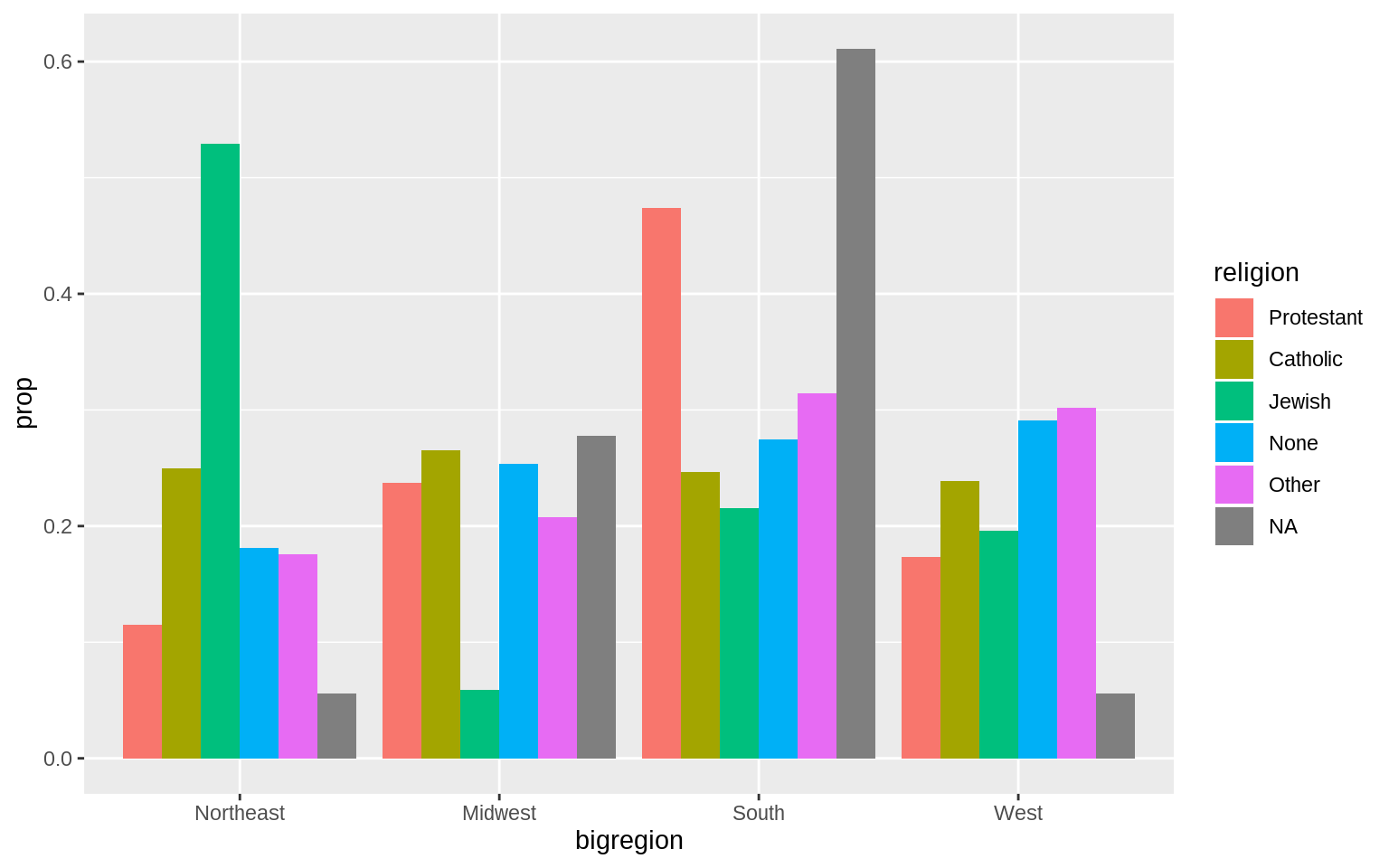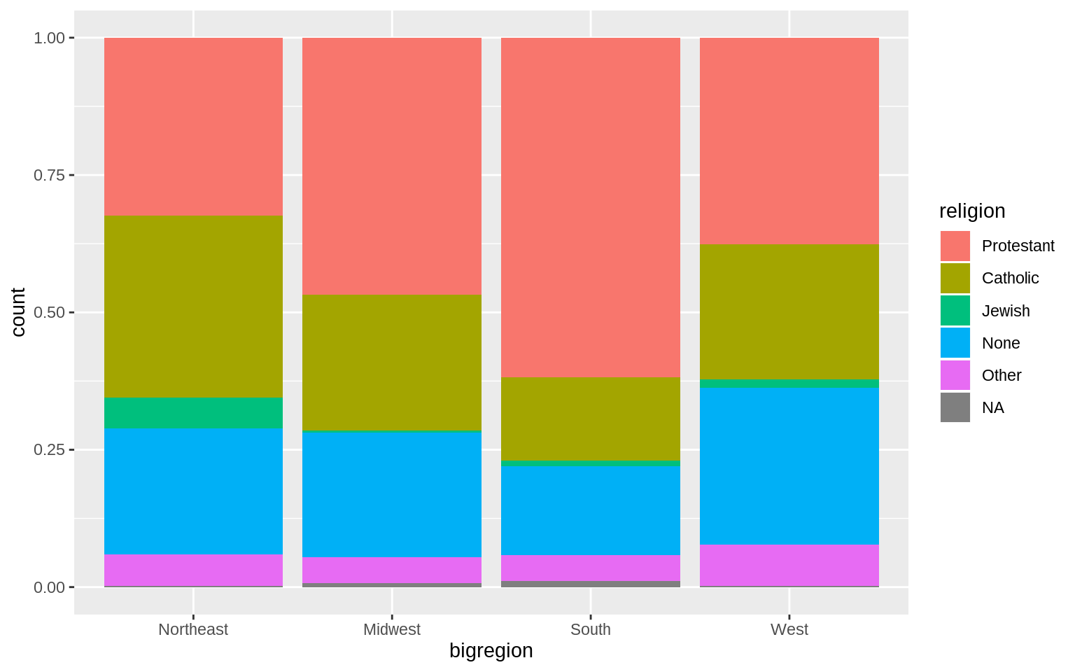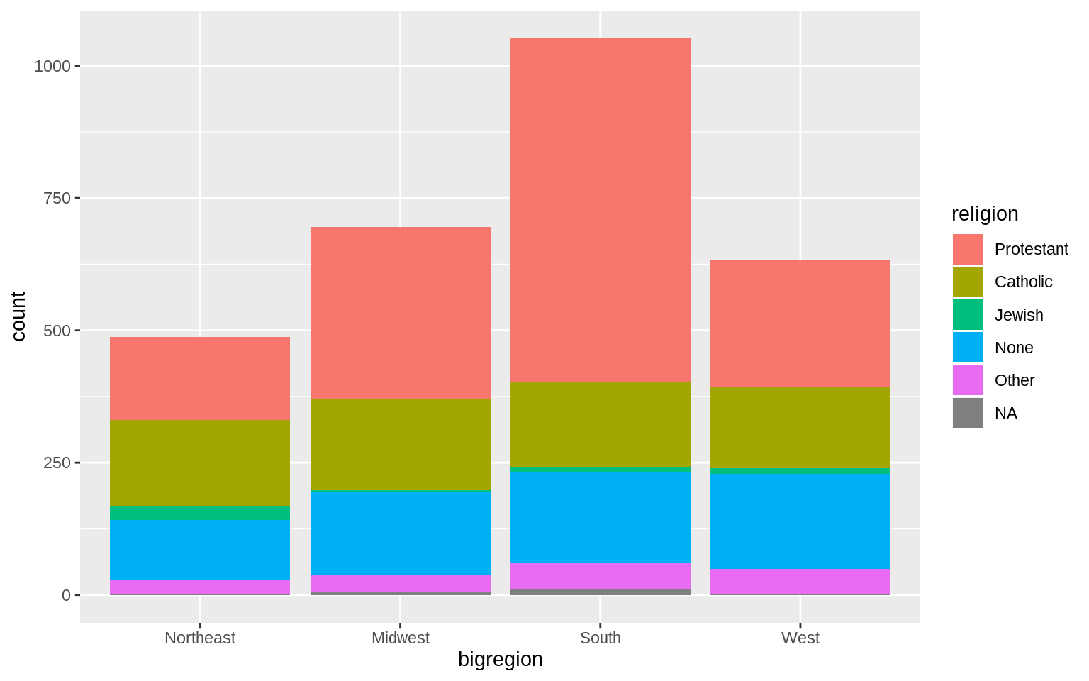 p <- ggplot(data = gss_sm, mapping = aes(x = bigregion, fill = religion))