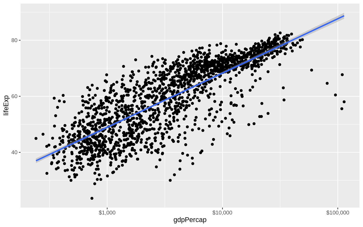 p + geom_point() + geom_smooth(method = "gam") + scale_x_log10()
