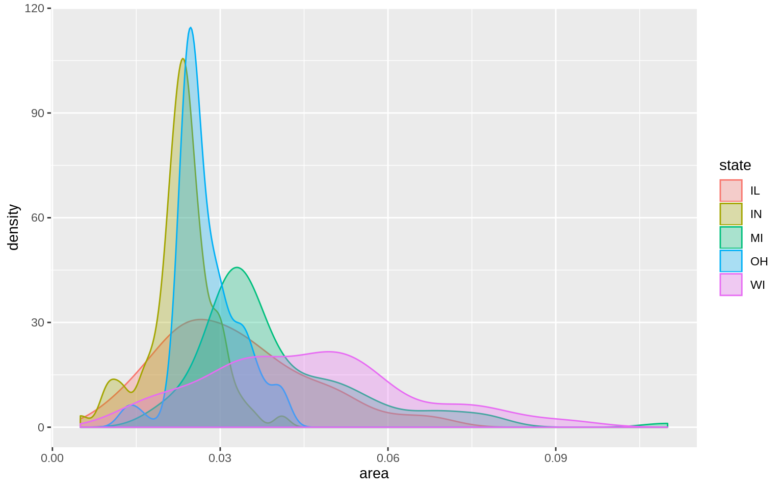 p <- ggplot(data = midwest, mapping = aes( x = area, fill = state,