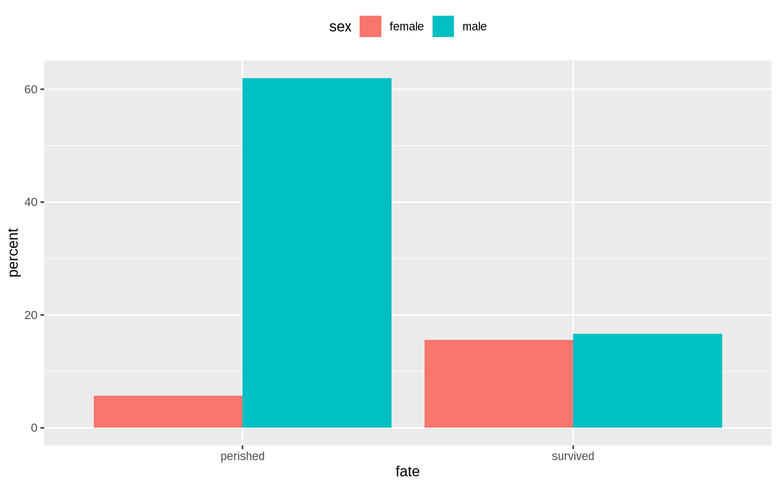 p <- ggplot(data = titanic, mapping = aes(x = fate, y = percent,