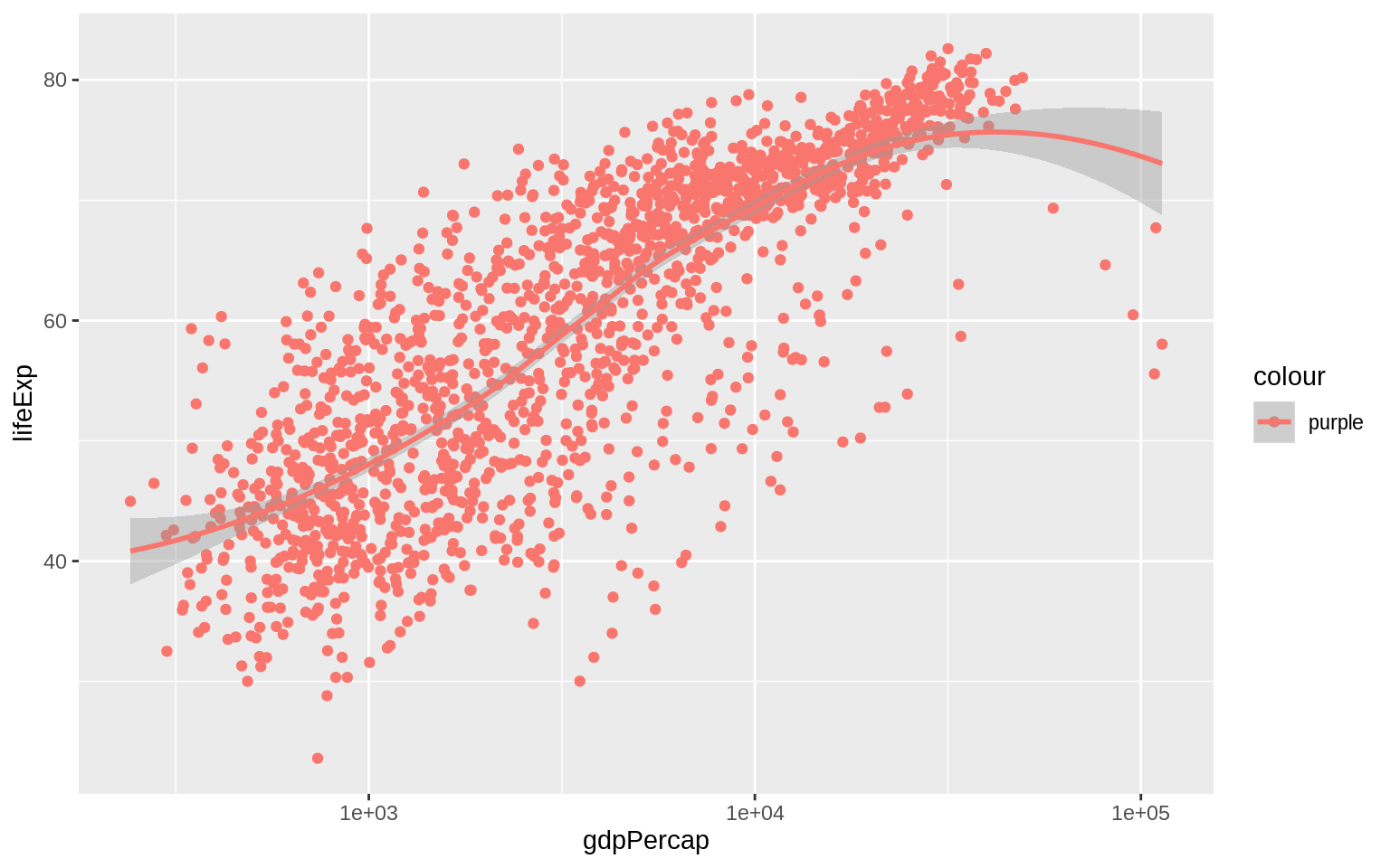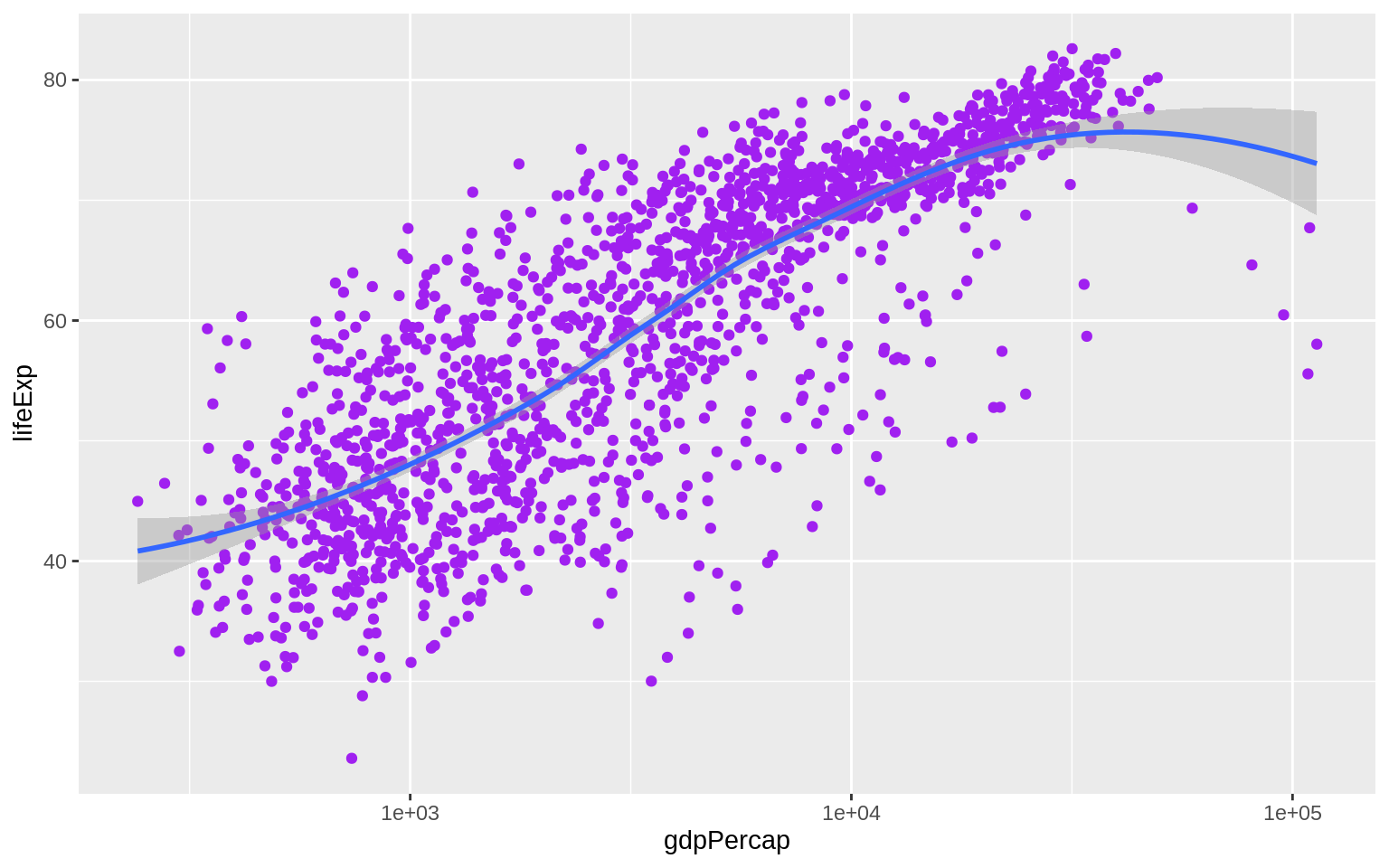 p + geom_point(color = "purple") + geom_smooth(method = "loess") + scale_x_log10()