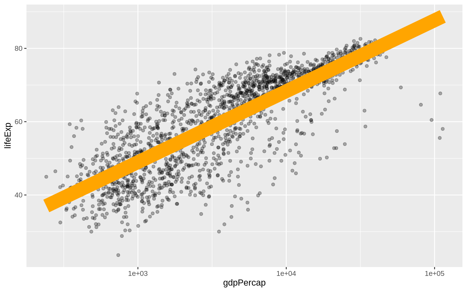 p + geom_point(alpha = 0.3) + geom_smooth(color = "orange", se = FALSE,