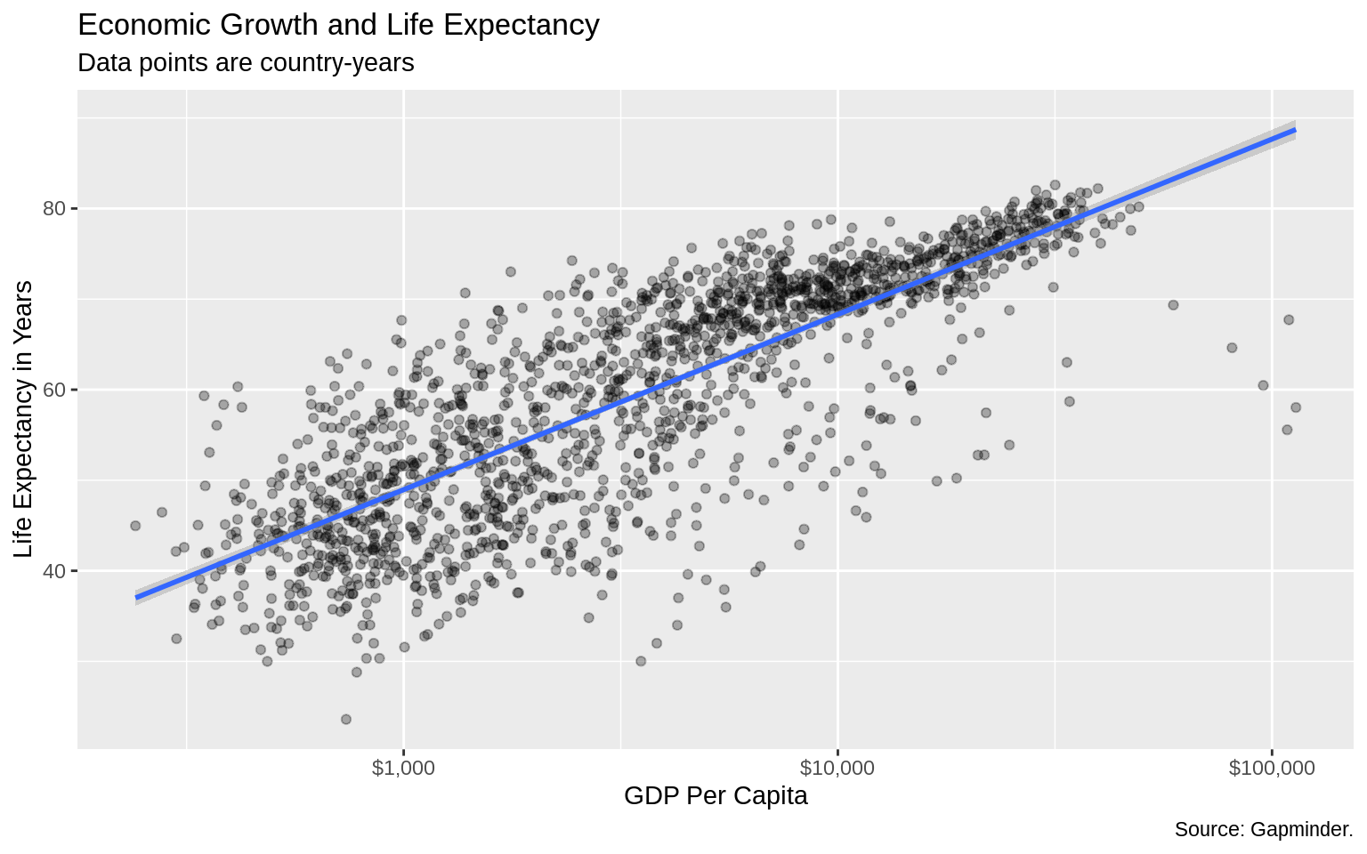 labs(x = "GDP Per Capita", y = "Life Expectancy in Years",